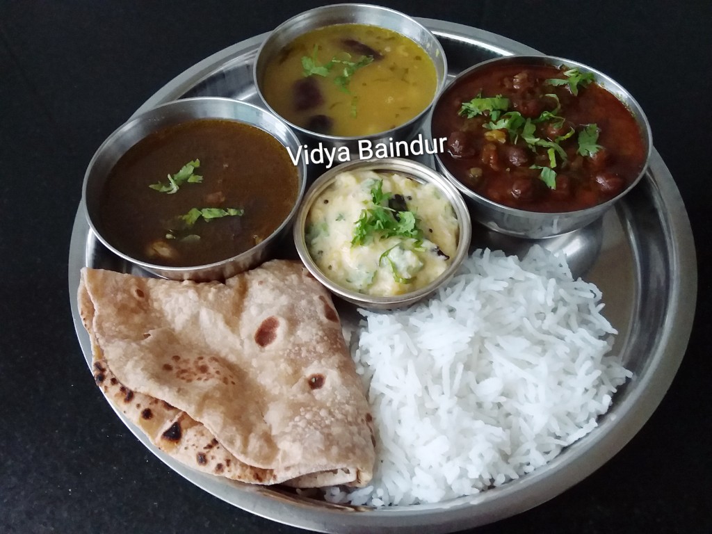 My Simple Thali... Zatpat Chana Masala... No frying masalas , Brown Chana Saar , Tadka Dal , Red Pumpkin Raita, Phulka ...n...Rice